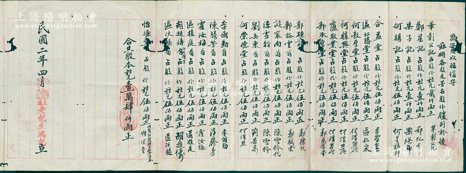 民国二年(1913年)上海老悦生鸿记“股东股份名录”1份,内中开列23名股东之占股份额,合共股本规元14000两;此乃清代老上海著名之广货店,在《中国资本主义发展史》一书中有记载;该号或属广东中山商人所创办,其股东梁焕南在“黄梁都创建(珠海斗门)和风书院序”中有提及;罕见且保存尚佳,敬请预览