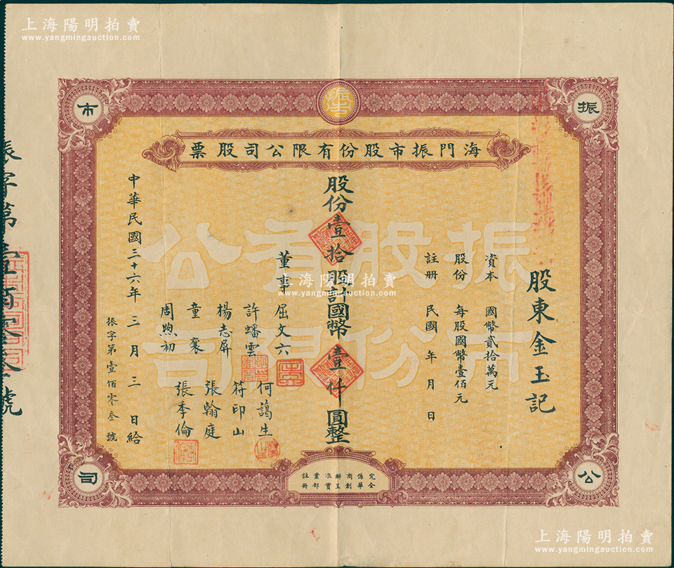 民国三十六年(1947年)海门振市股份有限公司股票,壹拾股计国币壹仟圆;此海门乃今浙江台州市椒江区,票上董事屈文六,即为民国初期之浙江都督屈映光氏;少见,八成新
