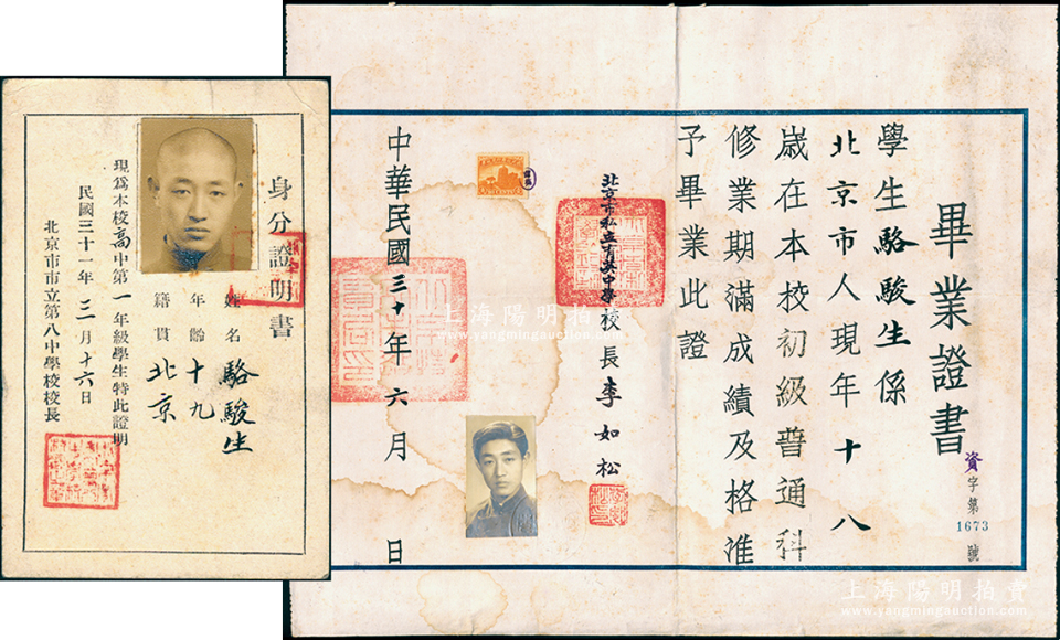 民国三十年(1941年)“北京市私立育英中学”毕业证书1张,发给学生骆俊生(骆泽民之子),另附1942年骆俊生氏“身分证明书”1张;此育英学校属美国公理会开办的教会学校,属昔年老北京之名校;源于骆氏家族之遗存,保存尚佳,敬请预览