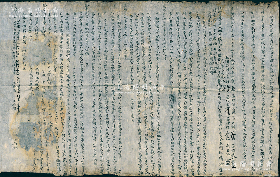 明代万历二十六年(1598年)徽州府传统“合同”1份,事为“吴熙寰等4人合夥买受庒坑小汪新旧贰项已业基屋,分作4股,各股递年租银贰钱”等情,且左边亦抄写有嘉靖三十八年(1559年)、隆庆元年(1567年)、隆庆四年(1570年)、万历二十六年之买地契文,对合夥产权之记录极为完整;此乃明代合夥购买物业出租之历史实物,见证明代股份制度之史实,且文字俊秀、内容精彩,堪称难得精品,保存