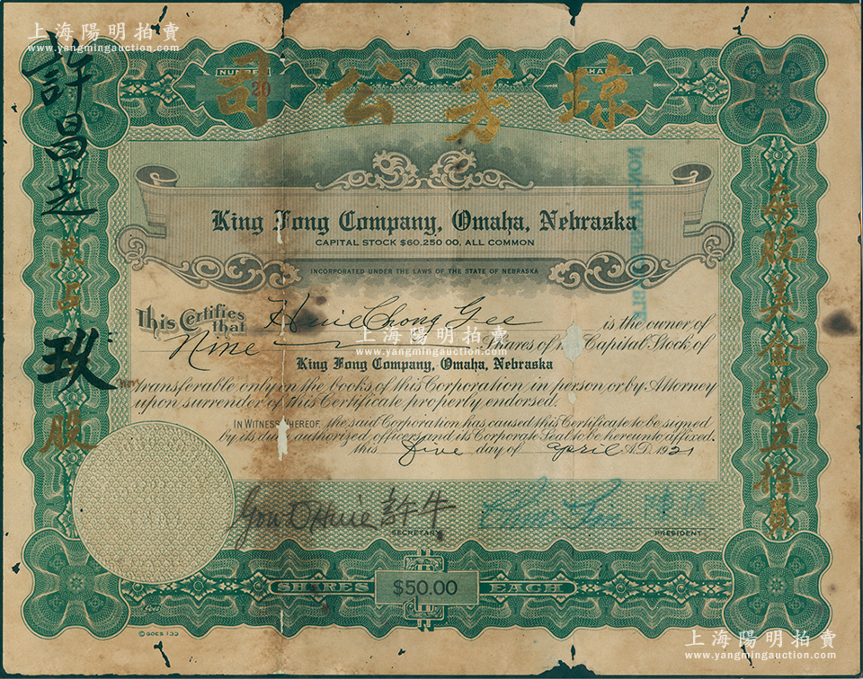 1921年琼芳公司股票,面额玖股(每股美金银五拾员),票上印有中文,由广东华侨发行于美国内布拉斯加州奥马哈;罕见品,背有小贴痕,近七成新,敬请预览