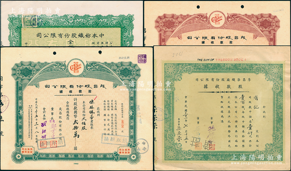 上海老股票4种,详分:1942年孚昌染织厂股款收据壹百股;1946年茂昌股份有限公司股款收据红棕色贰拾壹股、绿色贰佰股;1947年中本纺织公司股票壹万股;八至九成新