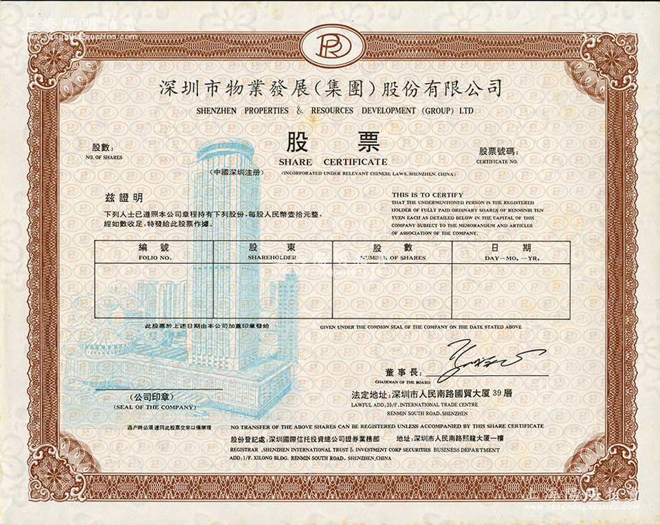 深圳市物业发展(集团)股份有限公司股票,未填用,内有梅花水印;该公司成功建设了深圳国际贸易中心大厦(八十年代神州第一楼)、皇岗口岸(我国最大的对外陆路口岸)等诸多知名建筑;苏健先生藏品,少见,九五成新