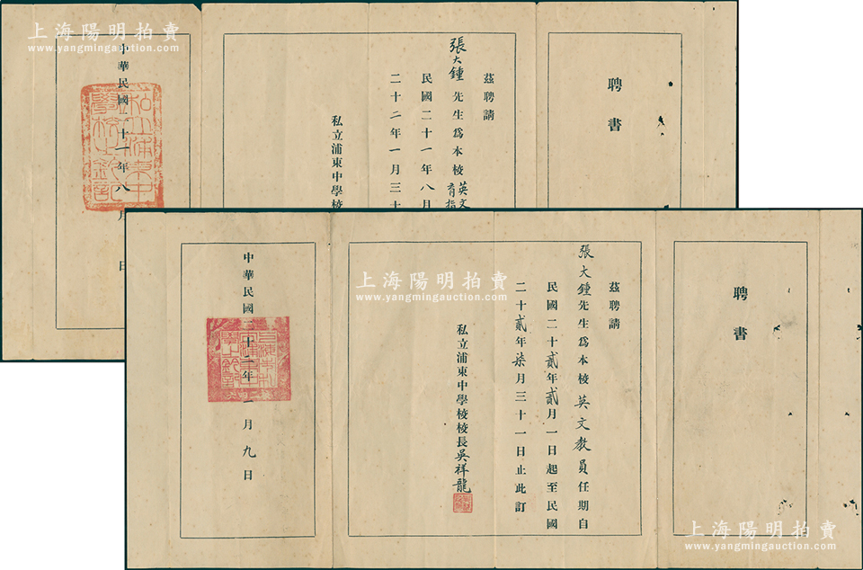 1932和1933年“私立浦东中学校”聘书共2份,分别聘请张大锺先生为“英文教员兼体育指导员”和“英文教员”,由校长吴祥龙签署;1907年上海营造业巨擘杨斯盛捐资创建浦东中学,聘黄炎培首任校长,成为上海浦东第一所中学,昔年学风严谨、人才辈出,如中共总书记张闻天、国民党蒋经国、蒋纬国兄弟、历史学家范文澜、罗尔纲等均毕业于此;少见且保存较佳,敬请预览