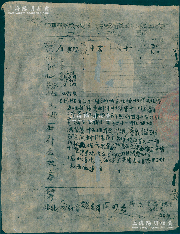 1937年中华苏维埃人民共和国中央政府驻西北办事处土地部印“土地证”1张,发给红宜县(今宜君县)中农白寿福氏,分给土地若干;此种土地证乃属西北苏维埃政权土地改革之历史实物,堪称重要之革命文献,存世如凤毛麟角,值得珍视和推重;保存尚佳,背有小贴补,敬请预览
