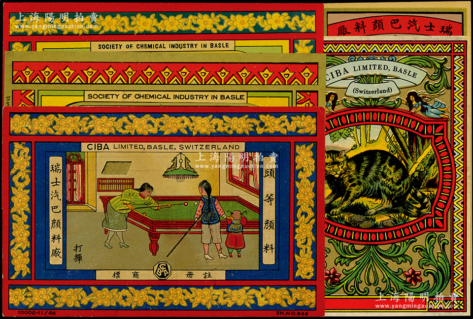 民国时期(上海)瑞士汽巴颜料厂彩色小广告共5枚全套,图案精美,九五成新