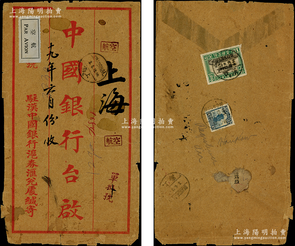 民国十九年(1930年)“驻汉中国银行沪券汇兑处”寄上海中国银行航空挂号公文封一个,背贴帆船1角和航空邮票15分各1枚,保存尚佳,敬请预览