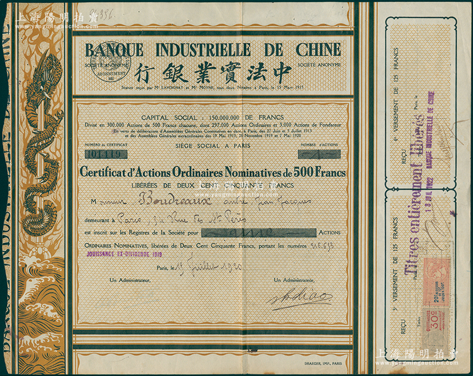 1920年中法实业银行股票,面额1股(每股500法郎),棕黄色盘龙图,此种版式少见;海外回流品,八成新