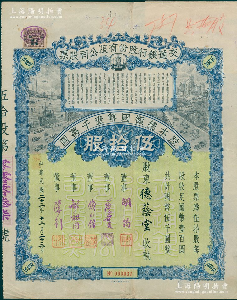 民国二十二年(1933年)交通银行股份有限公司股票,伍拾股计国币伍千圆,票上签名董事胡筠、唐寿民、钱永铭、胡祖同、陈行均为近代著名银行家,少见且富历史意义,八成新