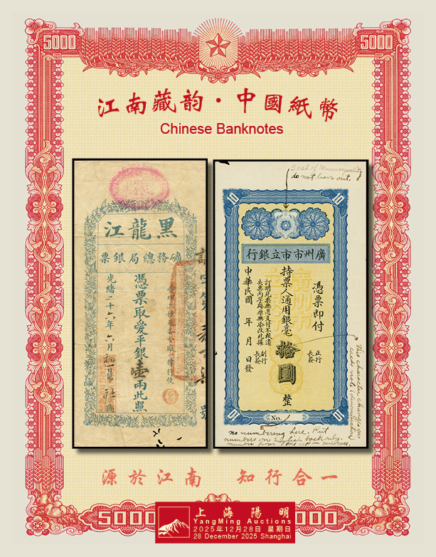 上海阳明拍卖之中国纸币部,面向海内外社会各界及收藏业界广泛征集中国各时期纸币、银行金融史料实物、世界各国纸币等精品。