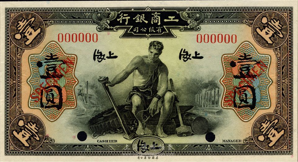 1923年工商银行壹圆样本券,上海地名,未正式发行;该行为著名之侨资银行,由著名银行家、“中国合作运动之父”薛仙舟氏所主持;全新