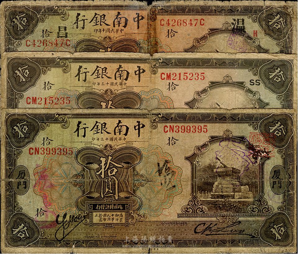中南银行纸币3种,详分:1921年上海拾圆,1924年上海拾圆、厦门拾圆;其中厦门地名拾圆券较为少见,六至七成新