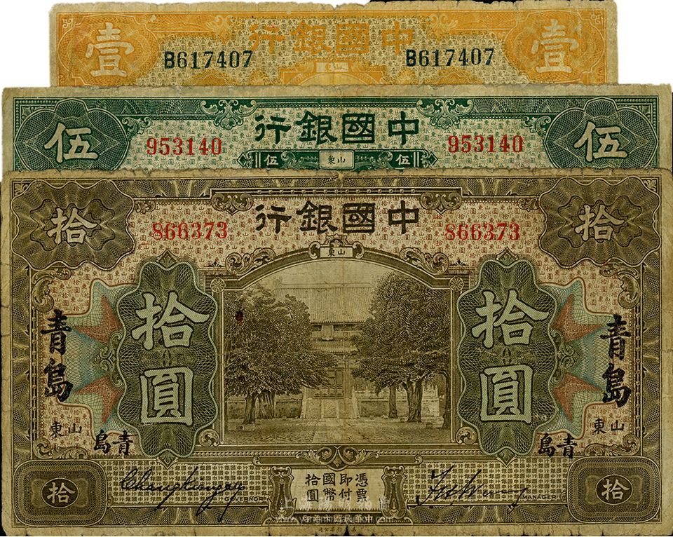 民国七年(1918年)中国银行壹圆、伍圆、拾圆共3枚全套,均为山东青岛地名,张嘉璈·王祖训签名,七成新