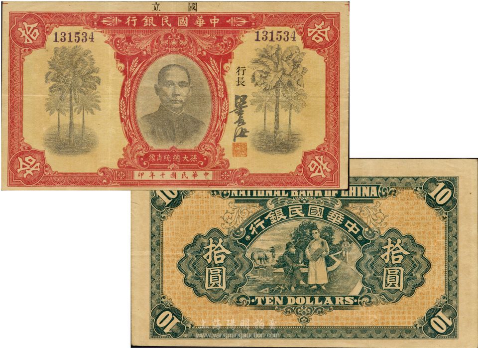 民国十年(1921年)中华国民银行拾圆,海外藏家出品,难得之较佳品相,八五成新