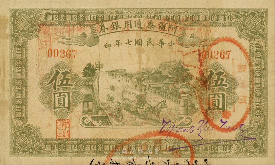 民国七年(1918年)阿尔泰通用银券伍圆,新疆特区纸币,近八成新