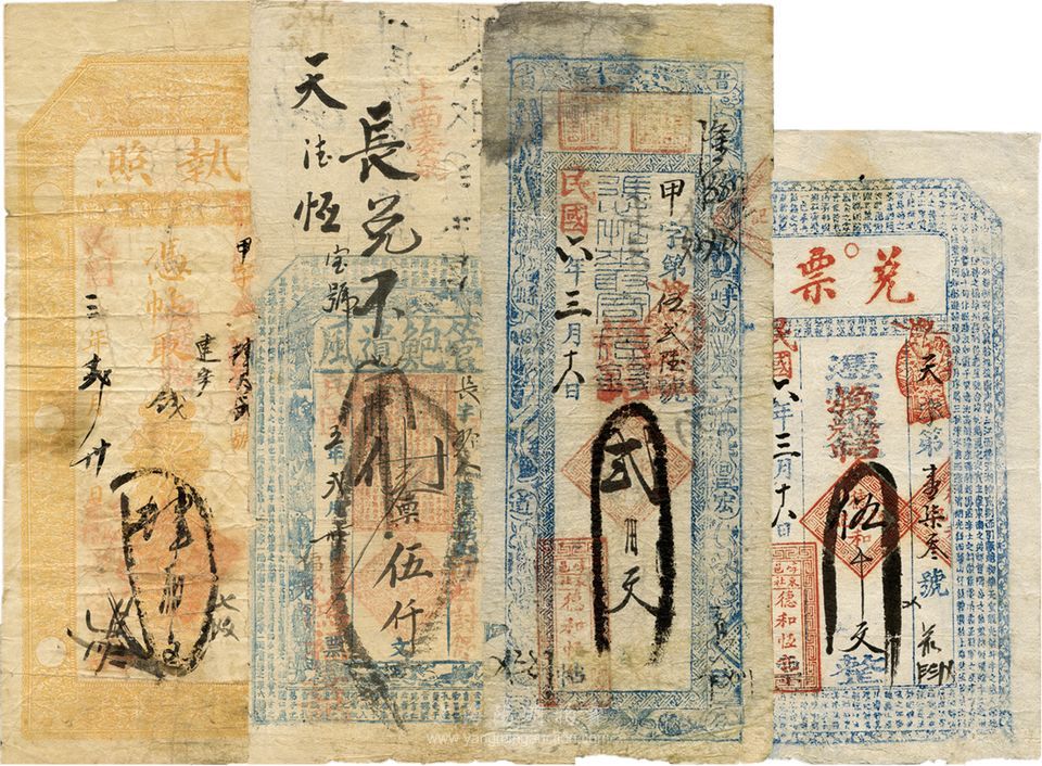 山西早期私帖4种,详分:(台邑)兴和永具·执照1914年肆百文;(黎邑)鸿福长记(管鲍遗风)1916年伍仟文;(崞邑)德和恒记兑票1917年贰百文、伍仟文;七至八五成新,敬请预览