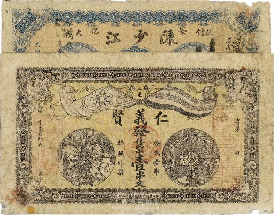 湖南钱庄票2种,详分:(益阳)仁义贤壹串文,上印地球与双旗;(安化)陈少江1918年南票壹串文,上印老人像;少见,七成新