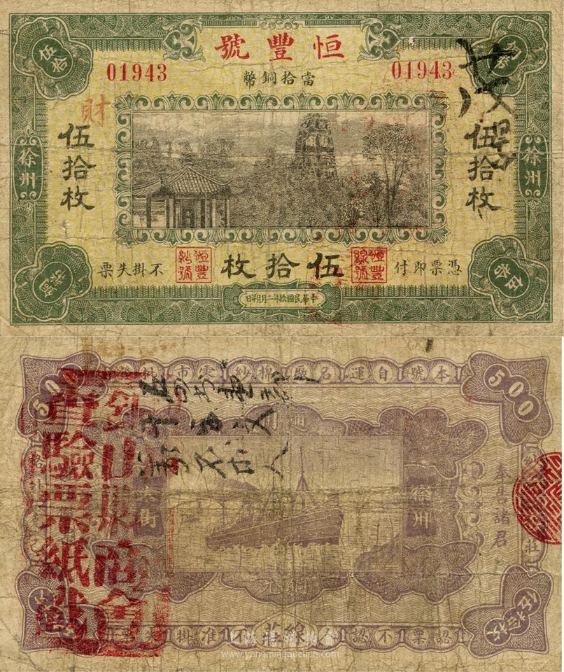 民国拾年(1921年)徐州·恒丰号当拾铜币伍拾枚,上印西湖十景之南屏晚钟图,背盖“铜山县商会查验票纸戳”印;附带有同图案之“南屏晚钟”明信片1张,罕见,七成新
