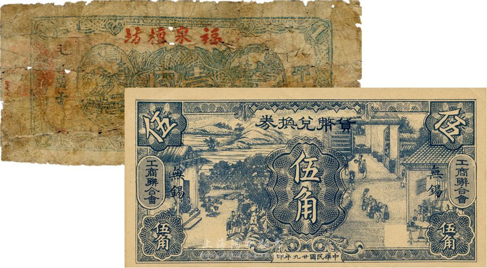 江苏民间钞票2种,详分:(邳县)福泉槽坊壹圆,近六成新;(无锡工商联合会)货币兑换券1940年伍角,九八成新