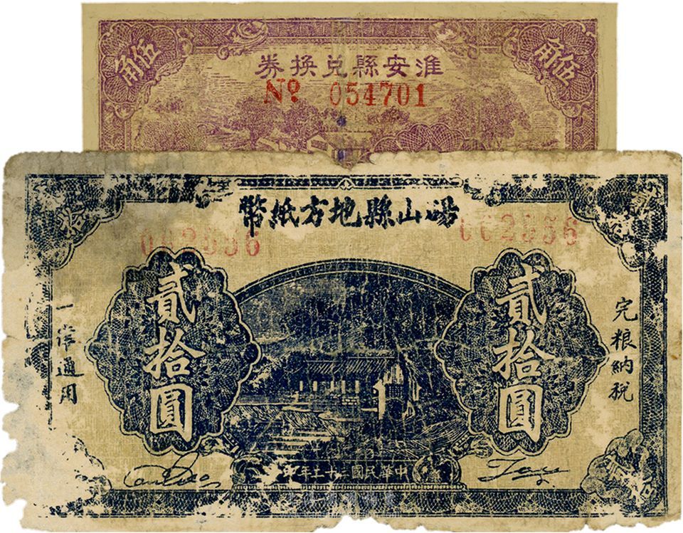 江苏抗战时期钞票2种,详分:淮安县兑换券1941年伍角;砀山县地方纸币1943年贰拾圆,背印人像;六至七成新