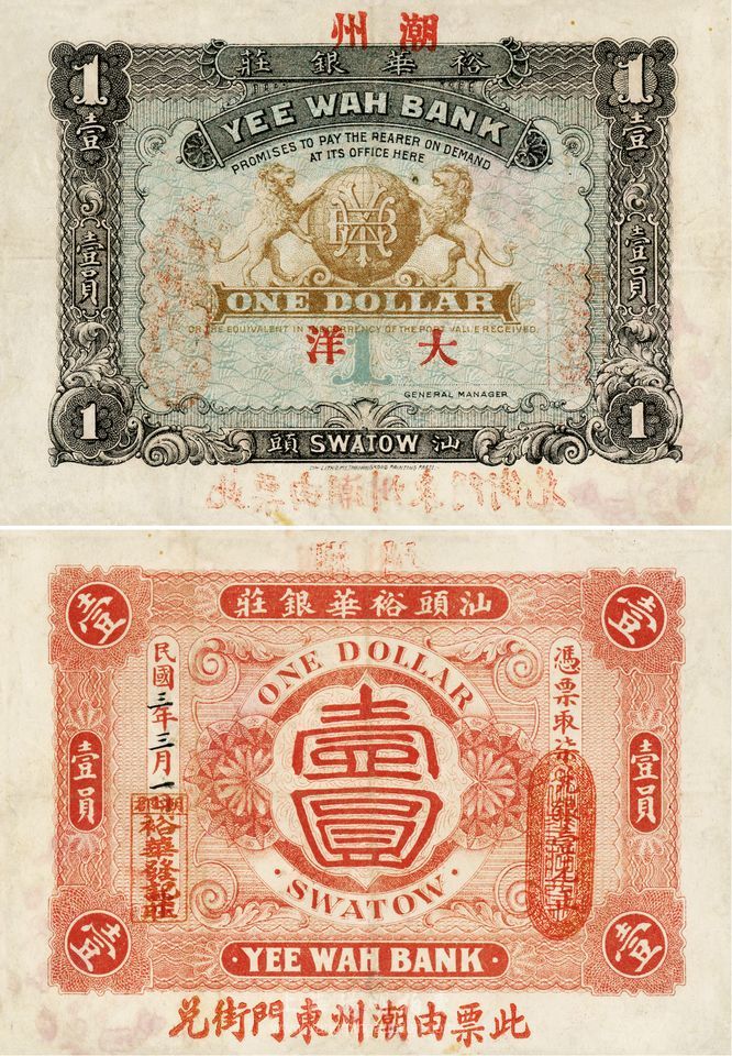 民国三年(1914年)汕头·裕华银庄大洋壹员,加盖“潮州”地名及“此票由潮州东门街兑”字样,罕见品,有小修,八成新