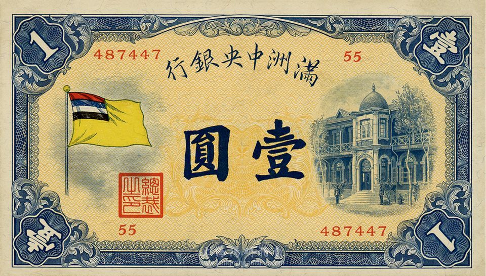 满洲中央银行甲号券五色旗版壹圆,上佳品相,未折九六成新
