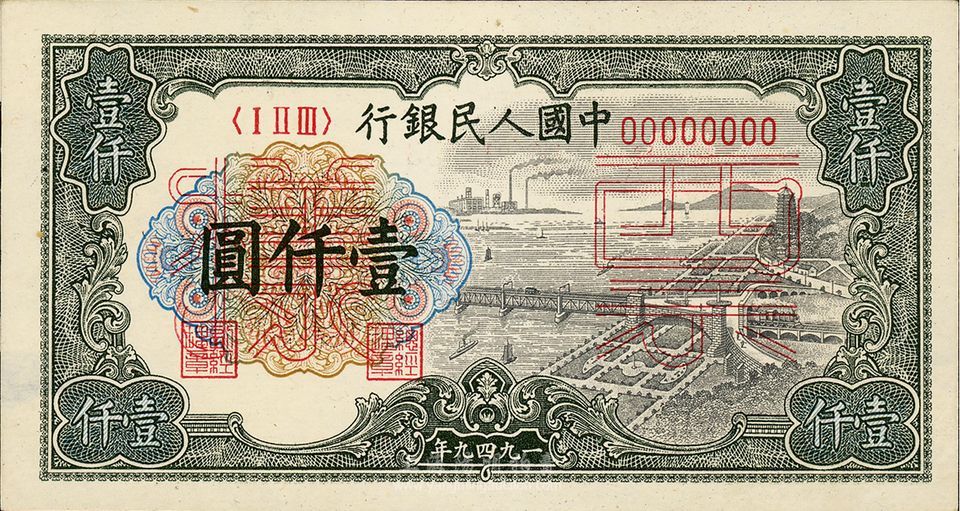 第一版人民币“钱江桥”壹仟圆票样,正背共2枚,未折九成新
