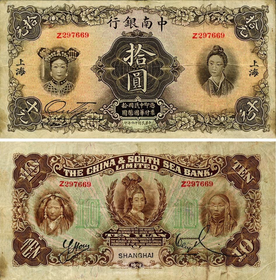 民国十六年(1927年)中南银行五女图拾圆,上海地名,海外藏家出品,已属较佳品相,原票八成新