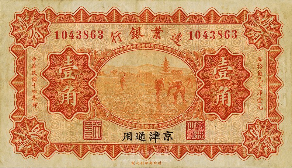 民国十四年(1925年)边业银行壹角,京津通用,左边职章为“天良”字样,八成新