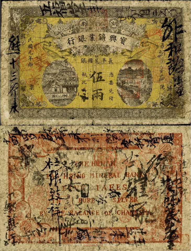 民国元年(1912年)湖南宝兴矿业银行伍两,少见且已属较佳品相,海外藏家出品,原票七成新