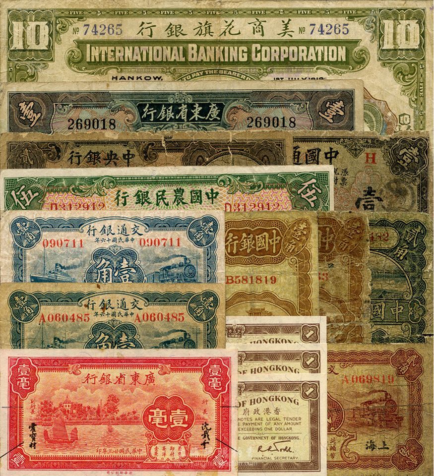 民国纸币一组共15枚,详分:中国通商银行1920年壹圆;中国银行1925年壹角2枚、贰角;交通银行1927年上海壹角无字轨、单字轨、贰角;中央银行花塔贰角;中国农民银行1935年伍圆;美商花旗银行1918年汉口拾圆仅半张;广东省银行1931年大洋券汕头壹圆、1934年壹毫;香港政府(1941年)壹仙3枚连号;四至九成新不等,敬请预览