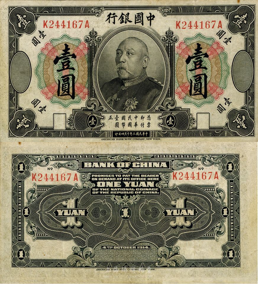 民国三年(1914年)中国银行袁世凯像壹圆,中国纸币之名誉品,少见,八成新