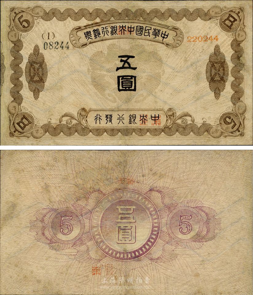 中华民国中央银行钞票五圆,珍罕品,有修补,七五成新