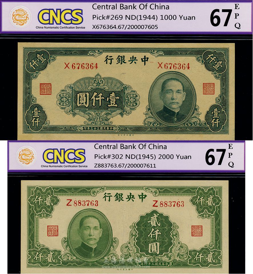 中央银行大业版1944年壹仟圆、1945年贰仟圆,均为单字轨,全新