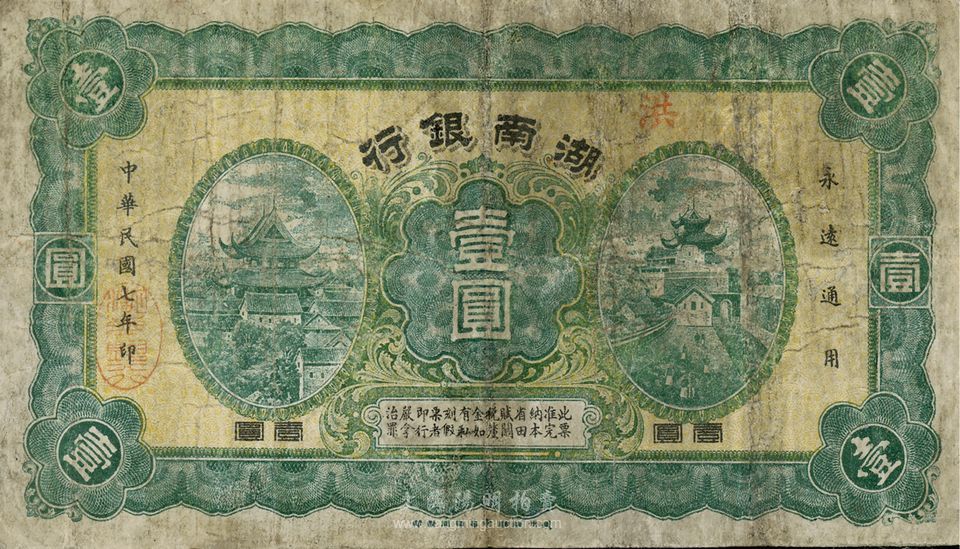民国七年(1918年)湖南银行壹圆,发行于护法战争时期,史称“永州新银行”,少见,七成新