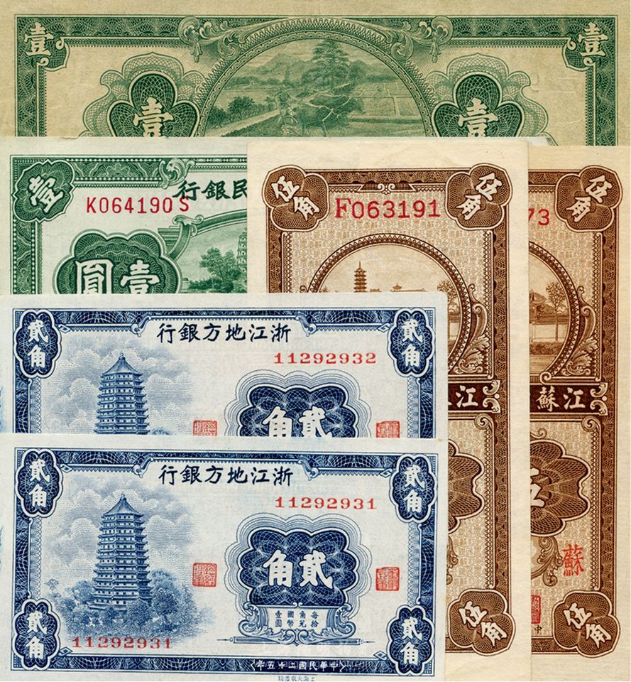 省钞6枚,内含:江苏省农民银行1936年大业版伍角、伍角加印“苏”字,1940年裕兴版壹圆,1941年大东版壹圆;浙江地方银行1936年贰角2枚连号;香港藏家出品,八五至全新