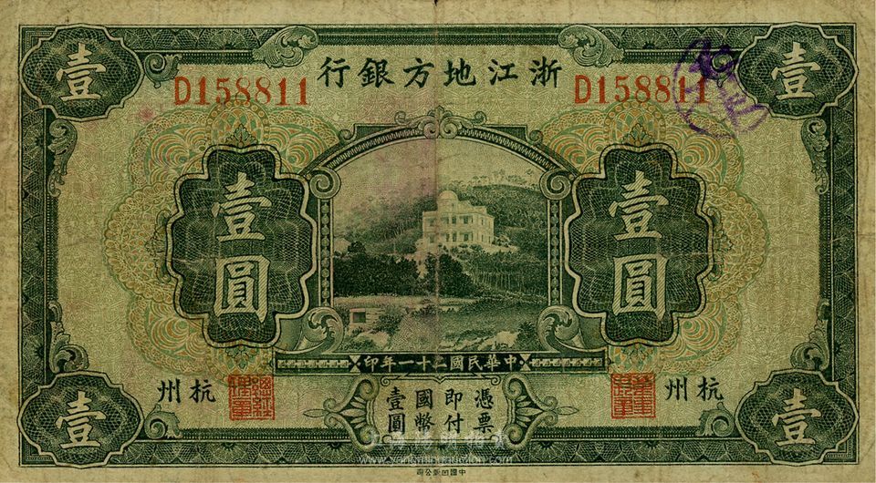 民国二十一年(1932年)浙江地方银行壹圆,杭州地名,海外藏家出品,七至七五成新