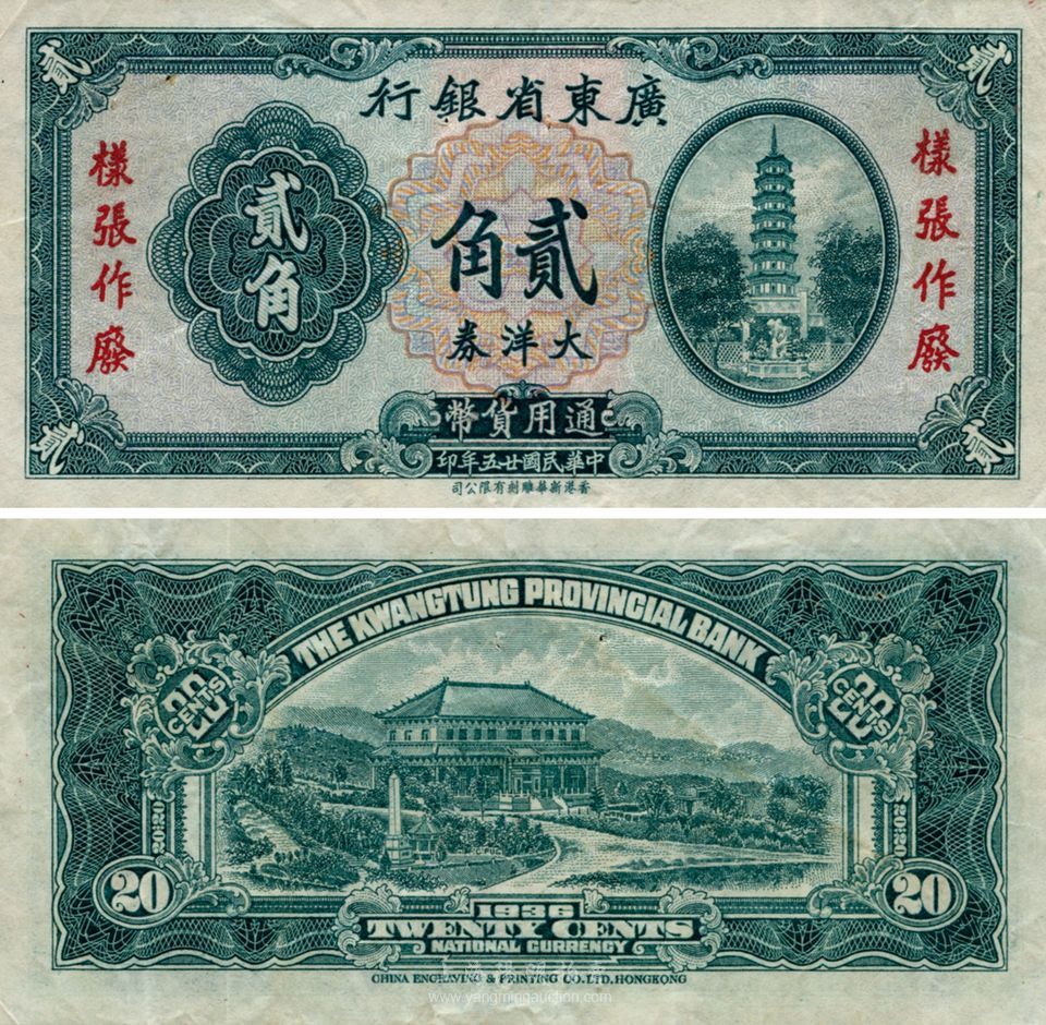 民国廿五年(1936年)广东省银行大洋券贰角,香港新华雕刻版,未正式发行样张,未见图谱记载,珍罕品,近九成新