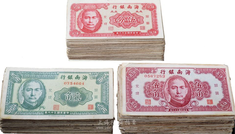 民国三十八年(1949年)海南银行纸币共316枚,内含伍分99枚、贰角107枚、伍角110枚,海外回流,六至八五成新,敬请预览