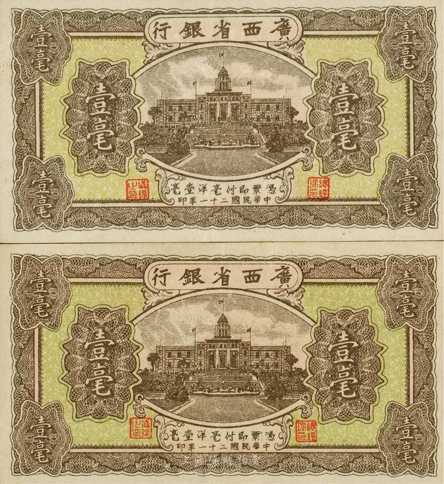 民国二十一年(1932年)广西省银行壹毫共2枚,版式可细分为大、小号码不同,海外藏家出品,难得好品相,九成新