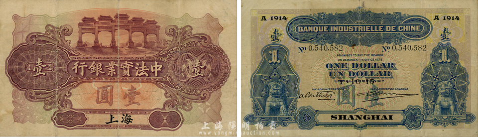 1915年中法实业银行壹圆,上海地名,森本勇先生藏品,少见且已属较佳品相,八成新