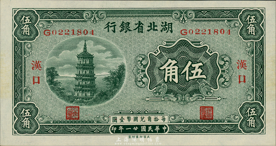 民国廿一年(1932年)湖北省银行伍角,汉口地名,背印南夔·贾士毅签名;森本勇先生藏品,全新