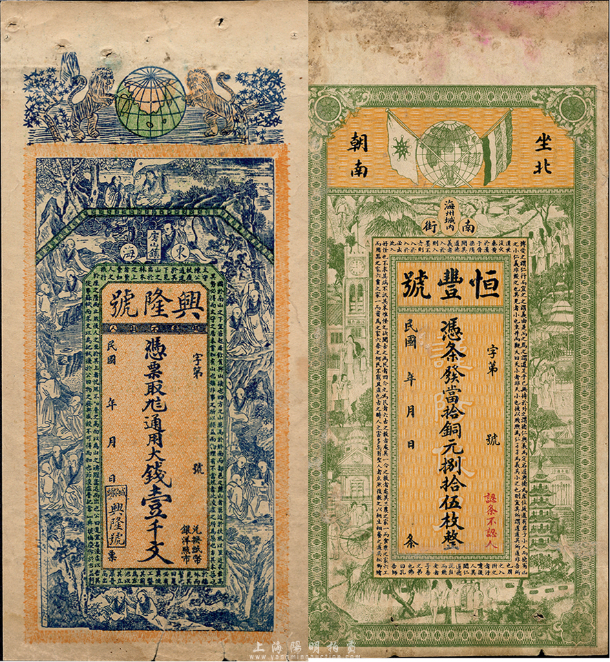 民国初期江苏海州地区钱庄票2种,详分:(海州)恒丰号当拾铜元捌拾伍枚,上印双旗地球和上海景观图;(东海)兴隆号大钱壹千文,上印和合二仙、十八罗汉图;此二券分由吴松卿和谈梅庆绘稿,设计美观;森本勇先生藏品,七至八成新