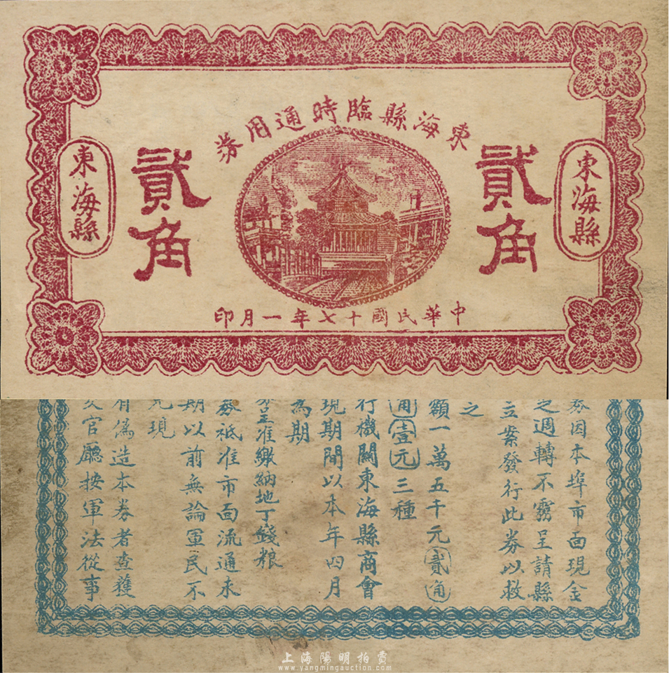 民国十七年(1928年)东海县临时通用券贰角,背印发行条例;森本勇先生藏品,八成新