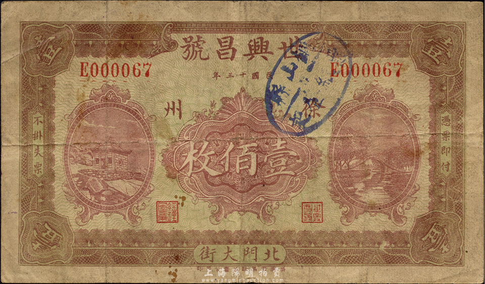 民国十三年(1924年)世兴昌号壹佰枚,徐州地名;森本勇先生藏品,少见,七五成新