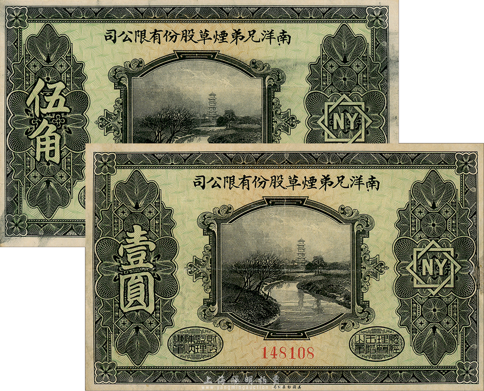 民国十五年(1926年)南洋兄弟烟草股份有限公司伍角、壹圆共2枚全套,森本勇先生藏品,八成新
