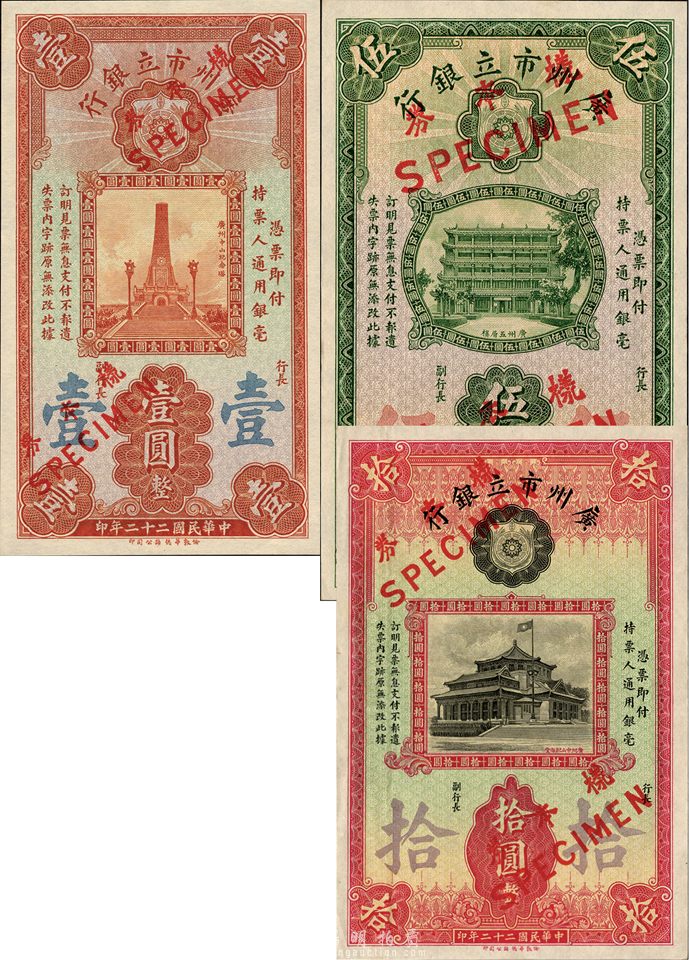 民国二十二年(1933年)广州市立银行华德路版壹圆、伍圆、拾圆样本券共3种一套,各正背2枚;森本勇先生藏品,全新