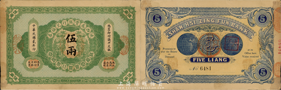 民国贰年(1913年)陕西秦丰银行兑换券伍两,森本勇先生藏品,未折九成新