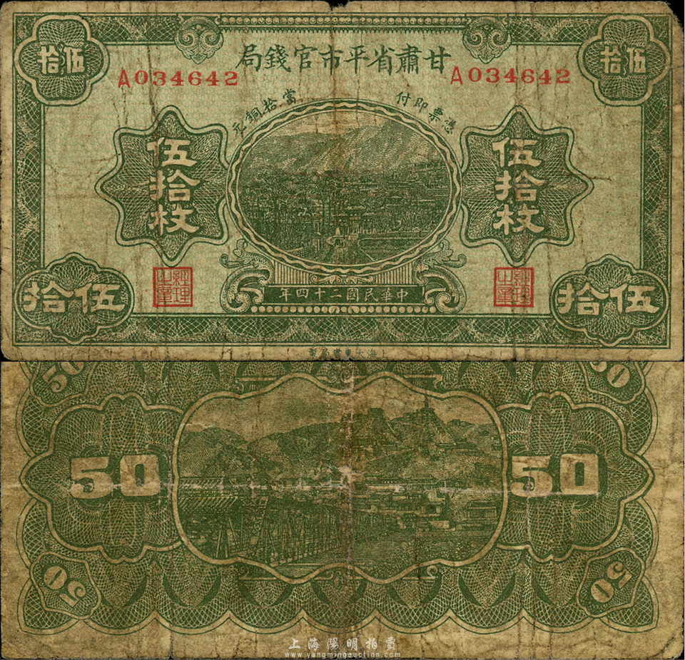民国二十四年(1935年)甘肃省平市官钱局铜元伍拾枚,森本勇先生藏品,源于日本前辈名家片冈裕三(汤岛)之旧藏,少见,近七成新