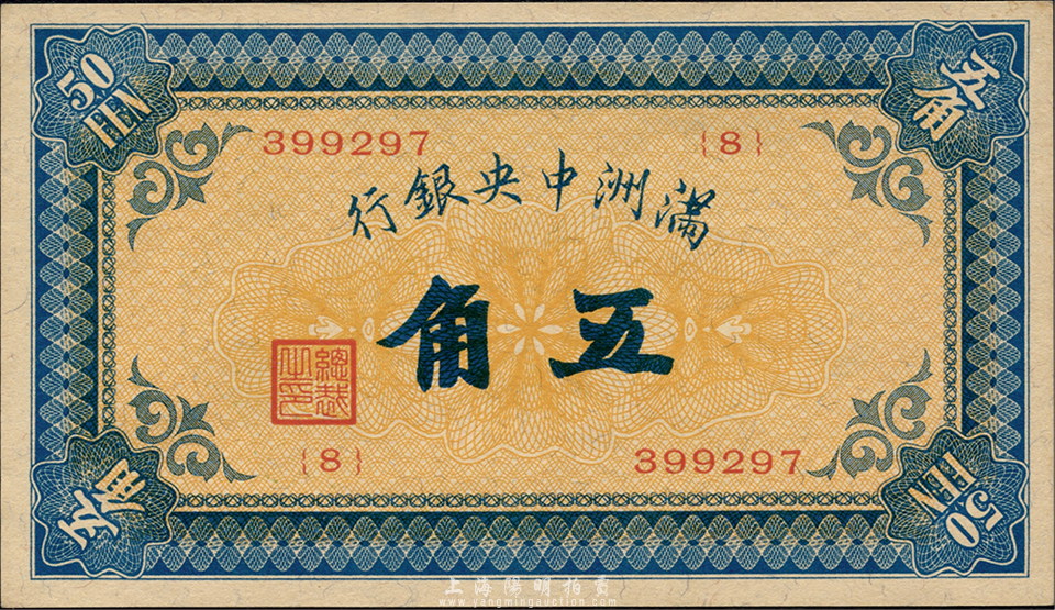 满洲中央银行(1932年)甲号券五角,森本勇先生藏品,少见且一流品相,九八成新